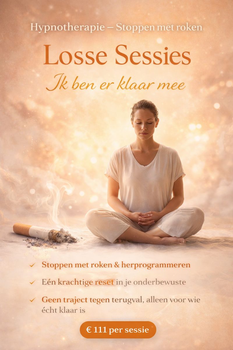 Deze sessie helpt je stoppen, maar is geen traject tegen terugval. Bij stress of emotionele triggers is er geen vervolg inbegrepen.